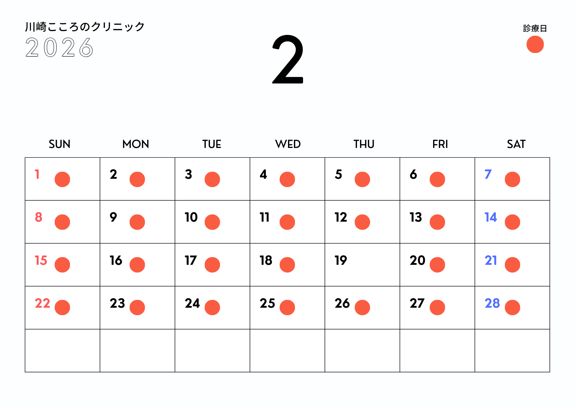 平素より当院をご愛顧いただき、誠にありがとうございます。 2026年2月の診療日について、ご案内申し上げます。 ←2026年1月の診療日はこちら ■診療時間 10:00~14:00、15:30~20:00 ■休診日 2月19日(木) ■診療日 上記休診日を除く、月曜日から日曜日まで、休まず通常通り診療いたします。 休診日をご確認の上、お間違えのないようご来院ください。 どうぞよろしくお願いいたします。 24時間受付中 WEB予約
